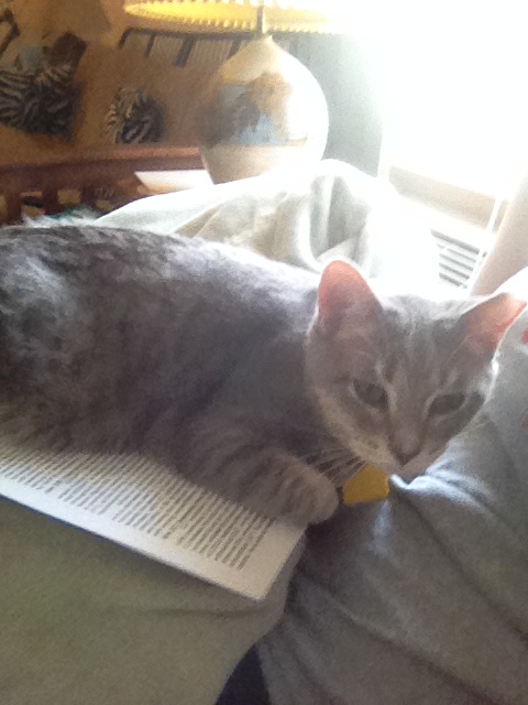 In the mean time, here’s a picture of my cat (Smeagol) cuddling up with a book that I read for class last semester: